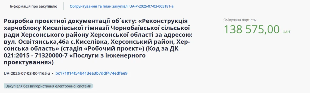 Роботи планується виконати за адресою: вул. Освітянська, 46а, село Киселівка, Херсонська область. Очікувана вартість “Робочого проєкту” – 138 575 гривень.