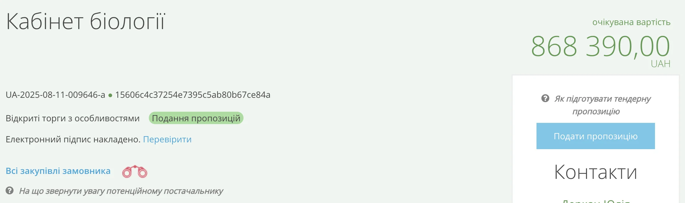 Наразі триває процес подання пропозицій. Остаточну суму, яку витратять на облаштування кабінету, можна буде дізнатися після завершення процедури закупівлі.