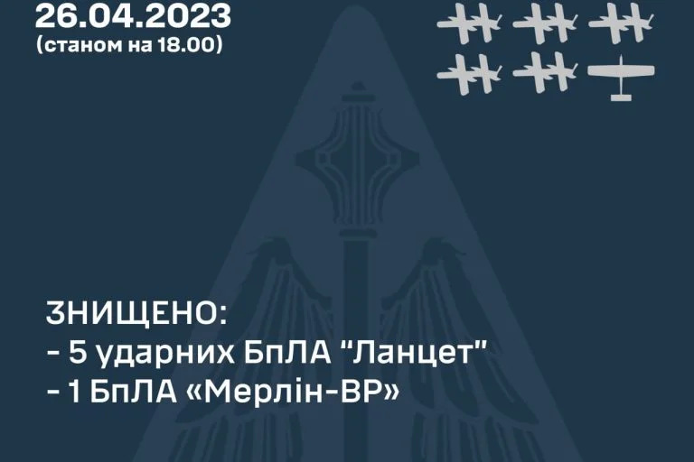 26 квітня українські повітряні сили знищили 5 російських ударних безпілотних літальних апаратів “Ланцет” та 1 розвідувальний БПЛА типу “Мерлін”.