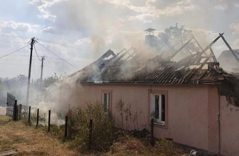 Зазначається, що внаслідок влучання ворожого снаряду на території приватного домоволодіння загорілись гаражне приміщення та дах житлового будинку.