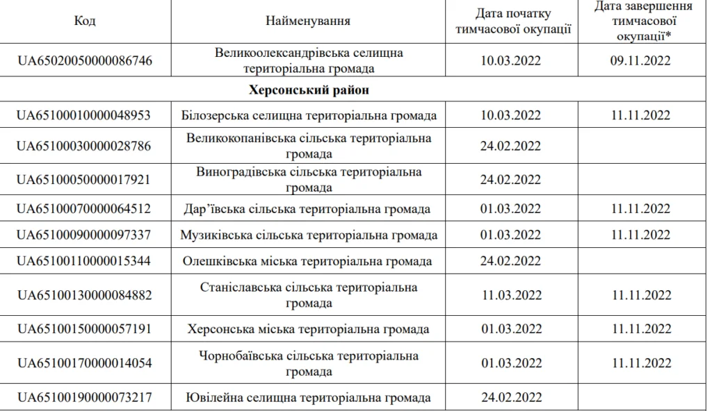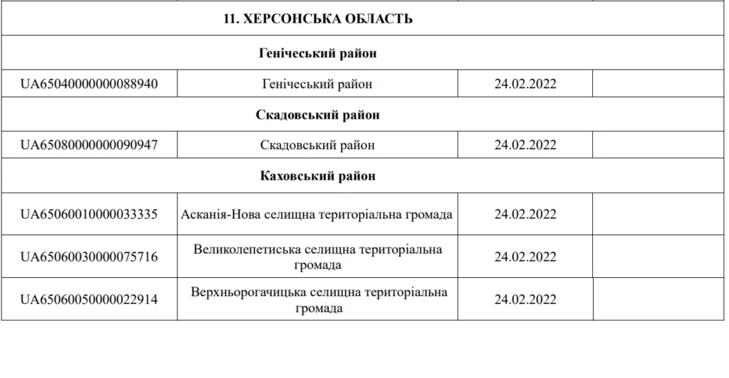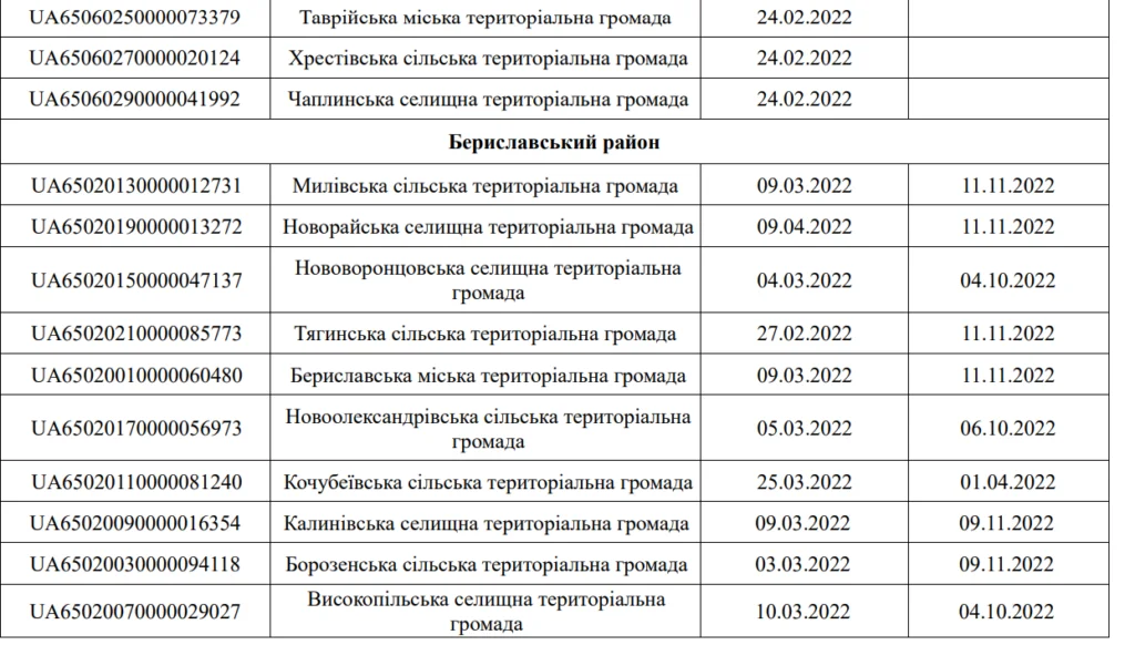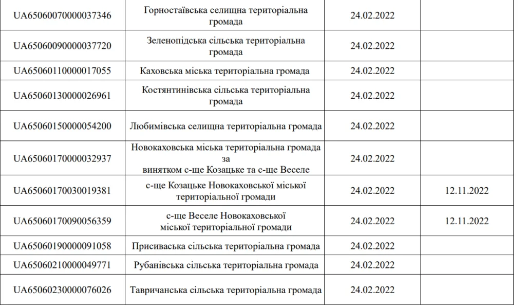 Території Херсонщини, на яких ведуться (велися) бойові дії або тимчасово окупованих Російською Федерацією відповідно до наказу Мінрегіону від 28 лютого 2025 року № 376 (зі змінами), додаємо нижче.