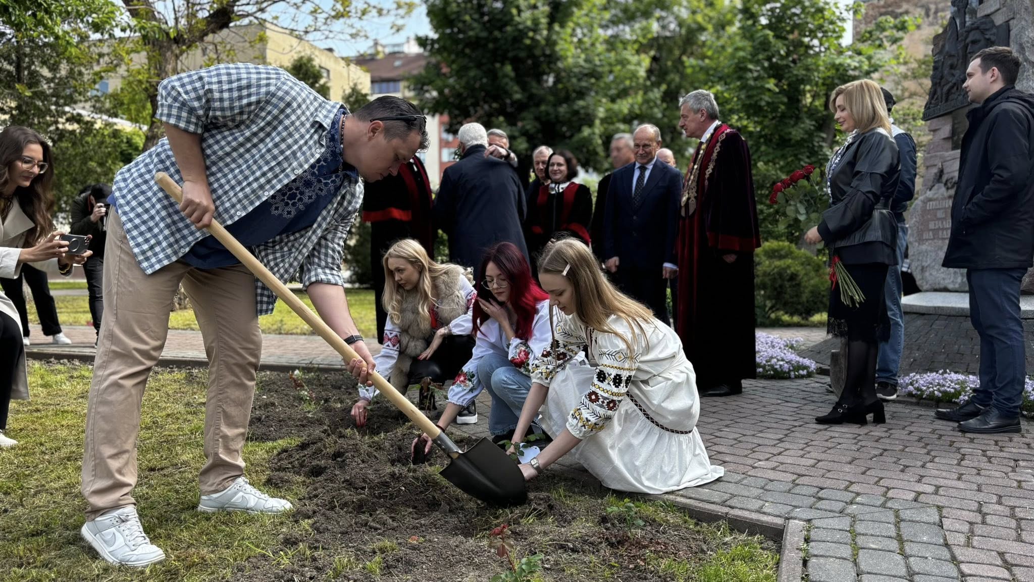 Квіти зростатимуть біля пам’ятника студентам та викладачам КНУ, які загинули у боротьбі за свободу України. До роботи долучилися викладачі та студенти обох закладів.