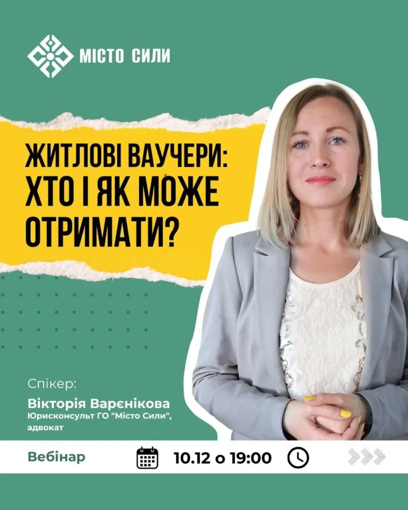 Спікеркою вебінару буде юрисконсульт ГО «Місто Сили» та адвокат Вікторія Варєнікова. Вона пояснить, які категорії осіб можуть отримати житловий ваучер і хто не має на це права, як працює комісія при подачі заявок, а також розповість про терміни формування ваучера та порядок його використання.