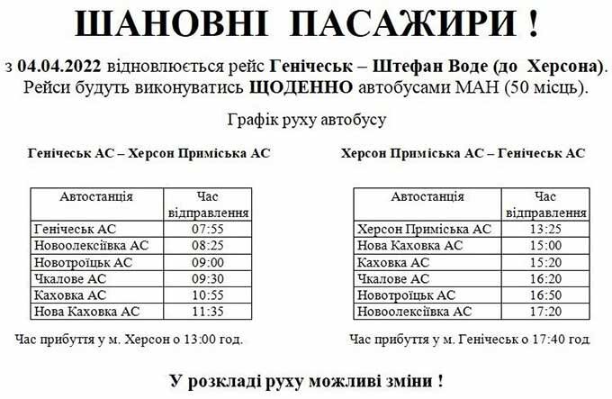 З 4 квітня відновлюється щоденне автобусне сполучення між Генічеськом та Херсоном.