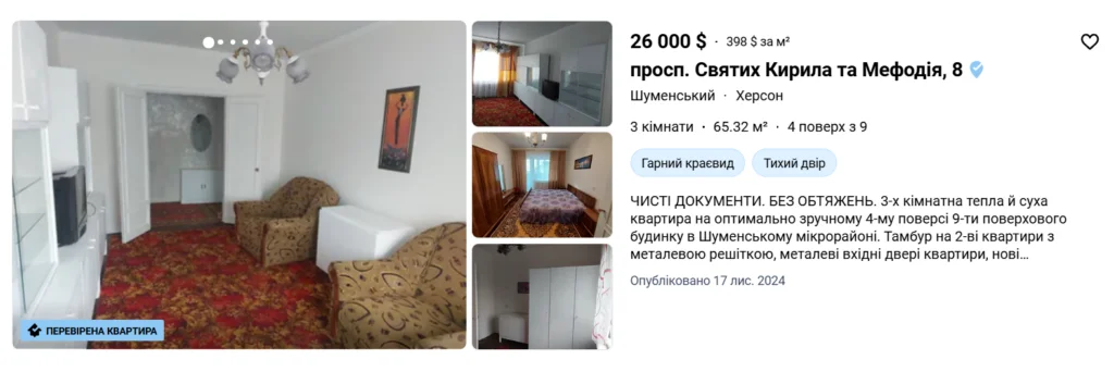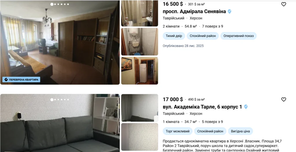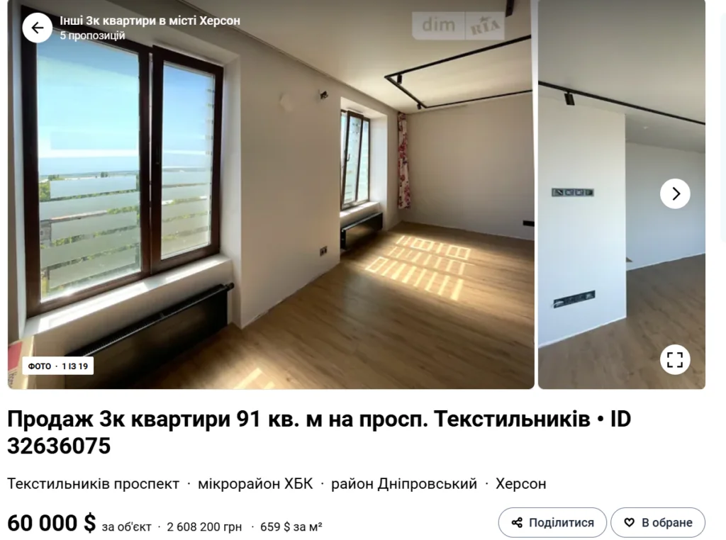 Втім, реальна картина продажу житла в області виглядає значно скромніше, ніж суха статистика. Станом на зараз на DIM.RIA у Херсоні було розміщено лише 19 активних оголошень про продаж квартир — у місті, де до повномасштабної війни жило майже 300 тисяч людей, і щорічно продавалися тисячі квартир.