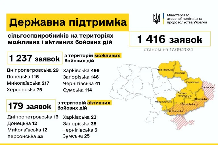 75 заявок подані з громад, які відносяться до зони можливих бойових дій. Ще 53 заявки подали аграрії з громад активних бойових дій.