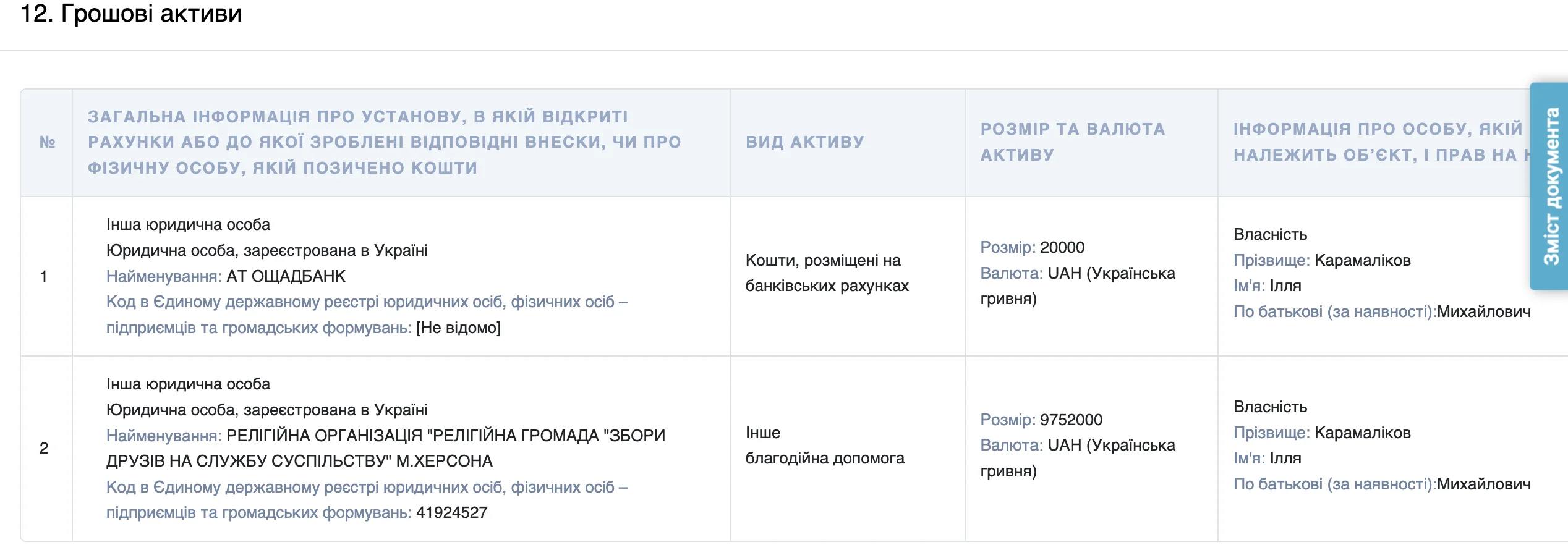 Найбільшим активом є сума у понад 9,7 млн грн. Ці гроші лежать на рахунку організації “Релігійна громада “Збори друзів на службу суспільству” м. Херсона”, якою керує Ілля Карамаліков.