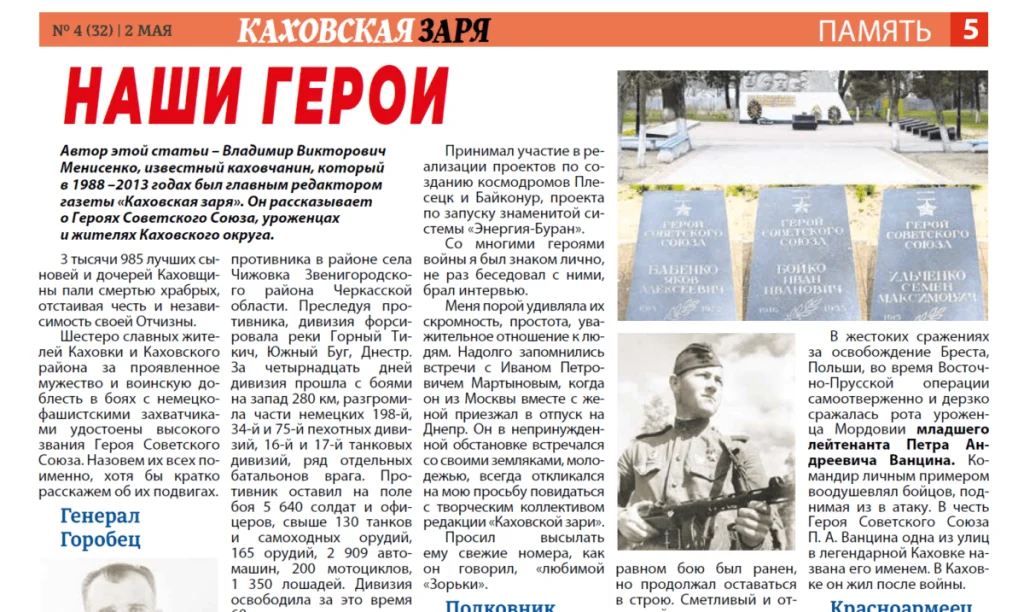 Публікація авторства Менисенка вийшла у випуску газети “Каховська зоря” від 2 травня. В ній чоловік розповідає про уродженців і мешканців так званого Каховського округу (територіальна одиниця запроваджена окупаційною владою, – МОСТ), які брали участь у Другій світовій війні.