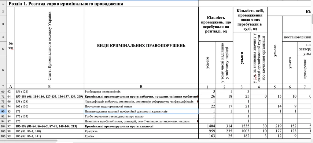 Статистика судів Херсонщини дуже проста — є вирок по одній справі. А от обласні поліція і прокуратура не змогли підрахувати точну кількість проваджень за журналістськими статтями. Так, у Херсонській обласній прокуратурі повідомили, що з лютого 2022 по травень 2025 року в області порушили чотири кримінальні провадження, по два за ст. 345-1 (Погроза або насильство щодо журналіста) і ст. 171 ККУ (Перешкоджання законній професійній діяльності журналістів). В обласному управлінні Нацполіції повідомили, що цей же період вони відкрили пʼять таких проваджень: два по статті 345-1 ККУ та три — по 171.